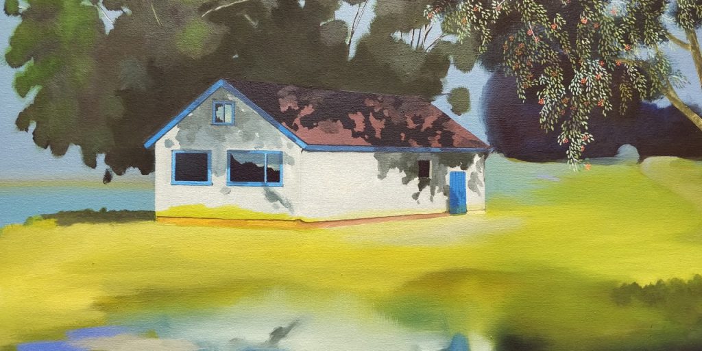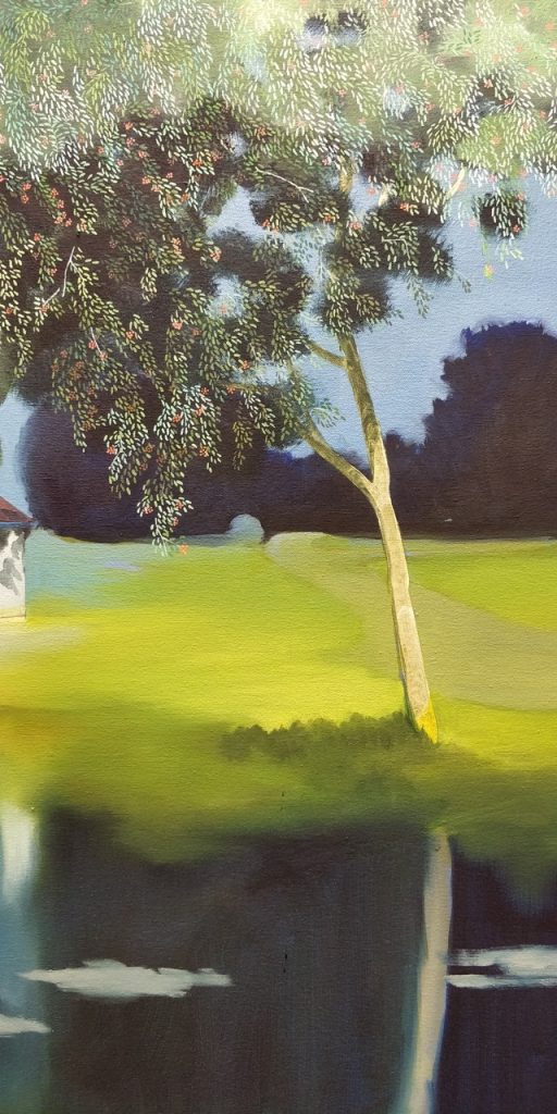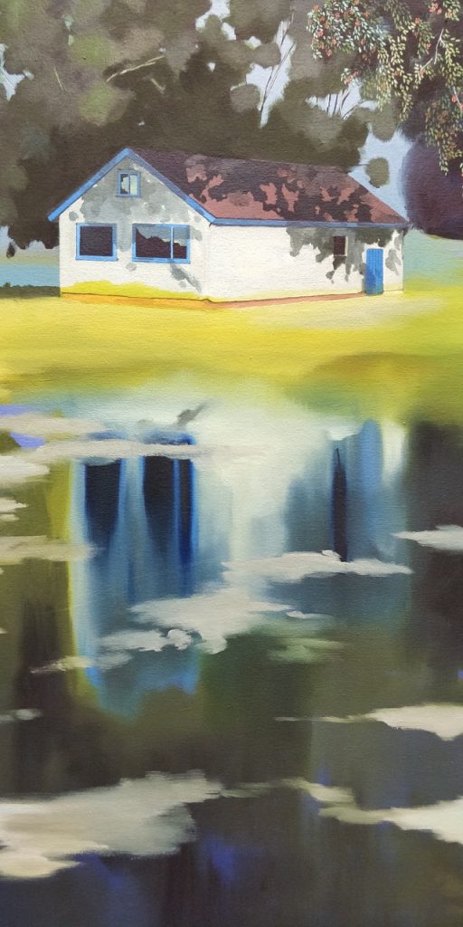 Swamp house is a fictitious landscape built up from found images through a moonlike screen. The tree is built up by borrowing a technique from Dutch renaissance landscape painting.